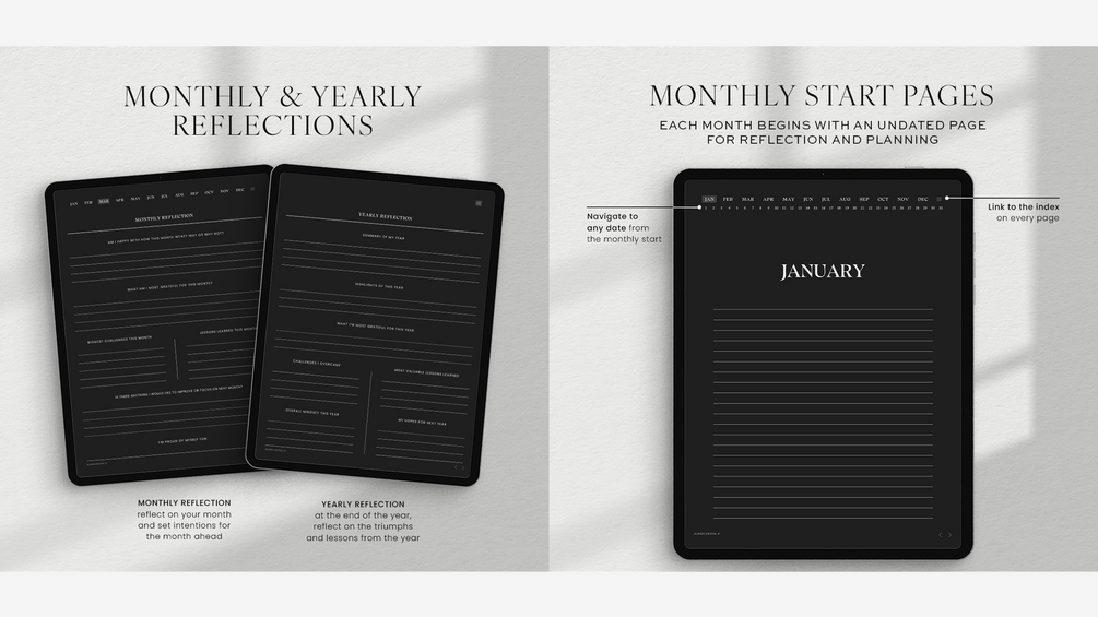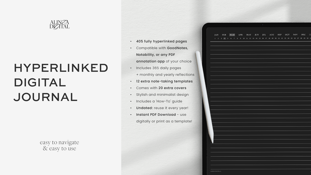Organize your thoughts and express your creativity with this Digital Daily Journal in Dark Mode. It features a beautiful cover (plus 20 free extra covers!) and hyperlinked pages for easy navigation. This is perfect for journaling, creative writing, list-making, note-taking, or personal reflection.
