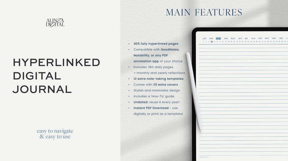 Organize your thoughts and express your creativity with this Digital Daily Journal. It features a beautiful cover and hyperlinked pages for easy navigation. This is perfect for journaling, creative writing, list-making, note-taking, or personal reflection.